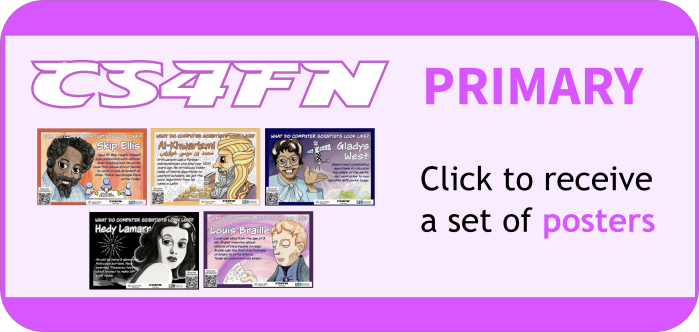 Use the pink form to receive a set of our A3 diversity in computing ‘heroes’ posters for primary schools. For teachers, librarians and home educators in the 🇬🇧 UK only (for others please download posters here).