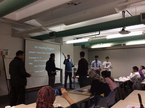 In the picture below the class have created an ‘insulting program’ which comes from the classroom activity ‘The Imp Computer‘ (PDF). That resource and all the other workshop resources can be downloaded from the Programming unplugged: learning programming without computers page.
