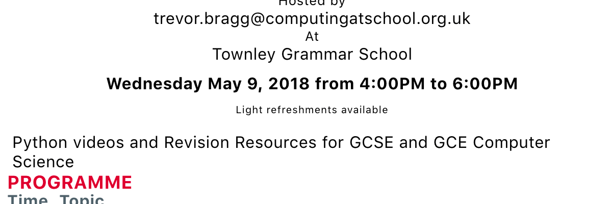 Trevor Bragg from CAS London and a teacher at Townley Grammar School will be hosting this free twilight event (4pm to 6pm-ish) on Wednesday 9th May 2018 at Townley in Bexleyheath (DA6 7AB). The event is aimed at teachers, though other interested folk are welcome to attend also.