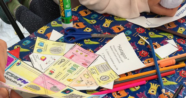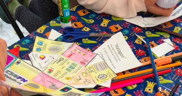 Aimed at primary school kids (~6 and up) this is a colouring in “brain” hat in which half of the hat relates to human brains and half to “computer brains”. This was a colouring in activity developed for the CS4FN stall at Queen Mary University of London’s “Festival of Communities” where we had lots of young children colouring them in, and parents cutting them out and gluing / taping them together for the kids to wear. We’re putting together some additional resources to go with the ‘hatagon’ (the hat is based on a tweaked half rhombicuboctahedron shape) and you can print your own here (for A3 and A4 printers). See the photos from the CS4FN stall here.