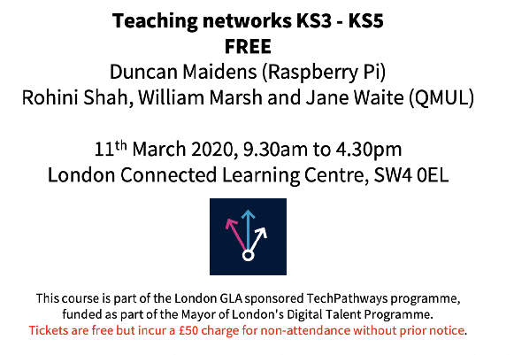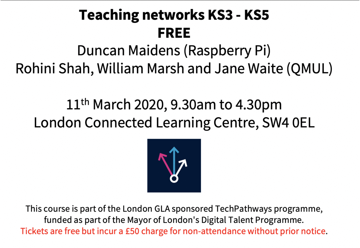 Duncan Maidens from Raspberry Pi (renowned expert on Networks), Rohini Shah, William Marsh and Jane Waite from Queen Mary University of London (helping out on pedagogy). This course is part of the London GLA sponsored TechPathways programme.