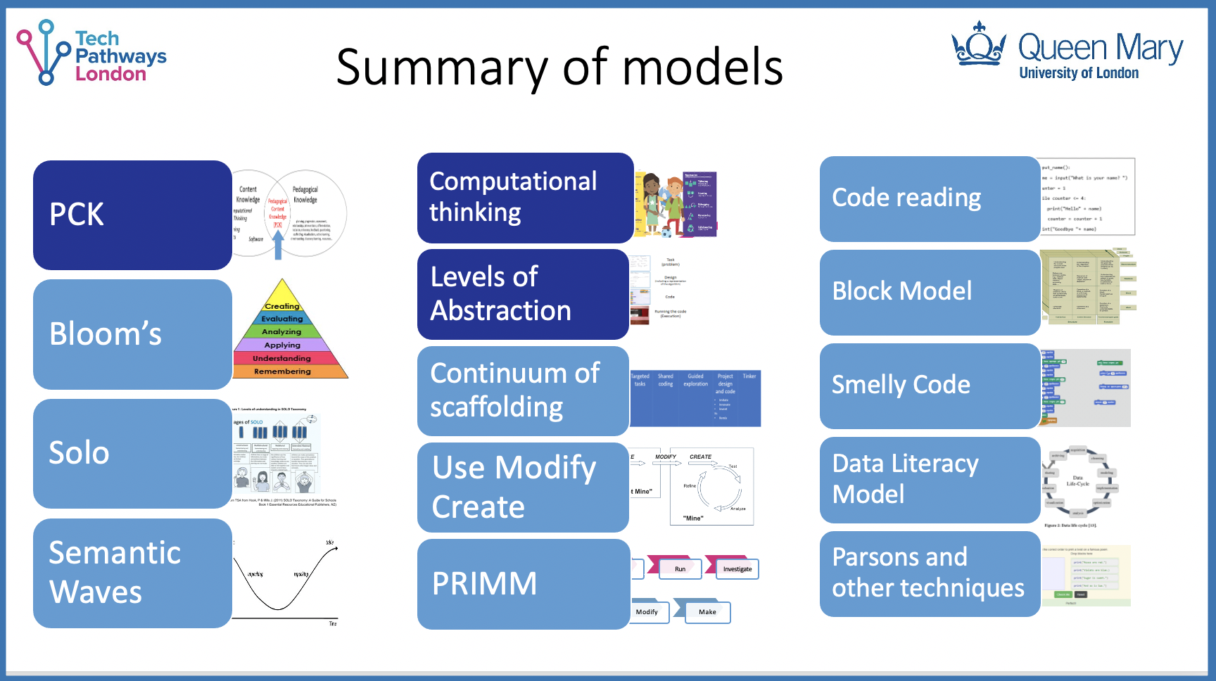 Come and learn about theory and practice, including (amongst other things) general learning theories and specific programming techniques such as PCK, Bloom’s Taxonomy, SOLO, Semantic Waves, Code Reading, Levels of Abstraction, Code Reading, PRIMM, Code tracing, Unplugged Computing and of course Computational Thinking.