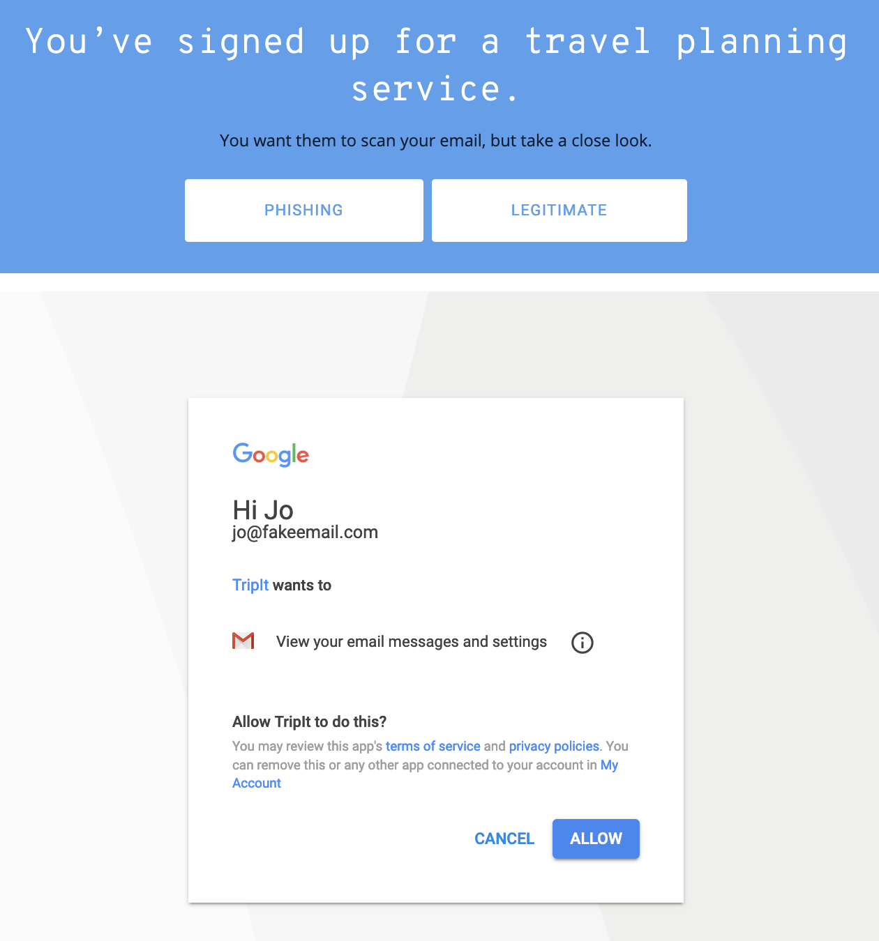 Give it a fake email address and it’ll show you some example emails. You pick whether it’s a phishing or legitimate one and it tells you what to look for. I scored highly… but not a perfect score.