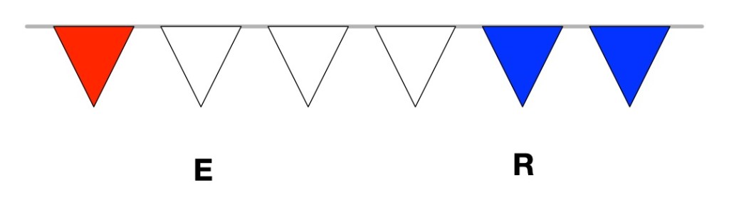 By using three colours, red, white and blue in place of 0, 1 and 2, so for example 0 is red, 1 is white and 2 is blue (as above), we get a mapping of letters onto triples of colours. Then, E for example is represented by RED-WHITE-WHITE and R is WHITE-BLUE-BLUE, so to spell out ER with this code would mean a string of bunting with colours: