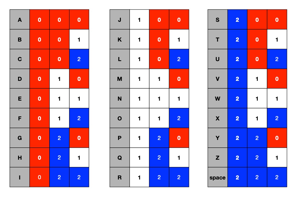 Imagine counting with only three digits, 0, 1 and 2. When we get to 2, to count one further we carry a 1 into the next column and go back to 0. When we get to 2 again we will carry another 1, turning the 1 in that second column to a 2. When we do it again, that 2 will go back to 0 and carry over into the third column. The full set of numbers 0-27 and so letters A-Z and space are then as shown below.