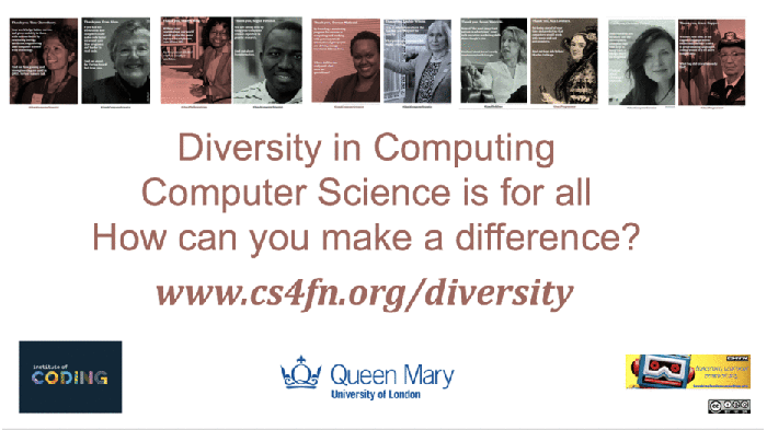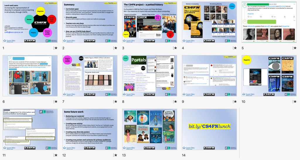 I (Jo Brodie) gave a ‘Lunch and Learn’ talk to QMUL colleagues on Tuesday 19th September 2023 about the work that the CS4FN project has done in helping teachers who want to increase the representation of diversity of computer science in their classrooms, free.