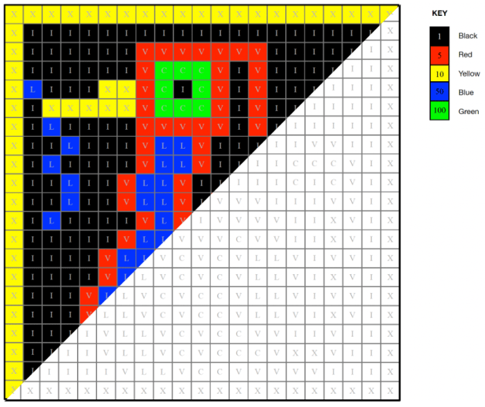 Our two Roman-themed puzzles are mosaics based on small coloured ’tiles’, like pixels. Each pixel colour is represented by a number (one of them uses Latin notation, V for 5 etc) and this is similar to the way in which digital images are stored. You could send the string of numbers to someone else and, as long as they know how to arrange them and have a copy of the representation code, they could recreate the image without ever seeing the original.