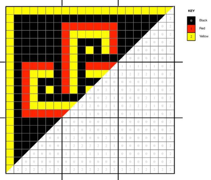 Each image has been decomposed into its constituent pixels and each pixel assigned a number. Print the puzzle sheet and follow the ‘colour by numbers’ code to fill the puzzle in. For the mosaic shape you could actually compress the information further, only a quarter of the file is really needed – the image is formed from the same unit repeated another three times with a 90 degree turn (rotational symmetry) each time.