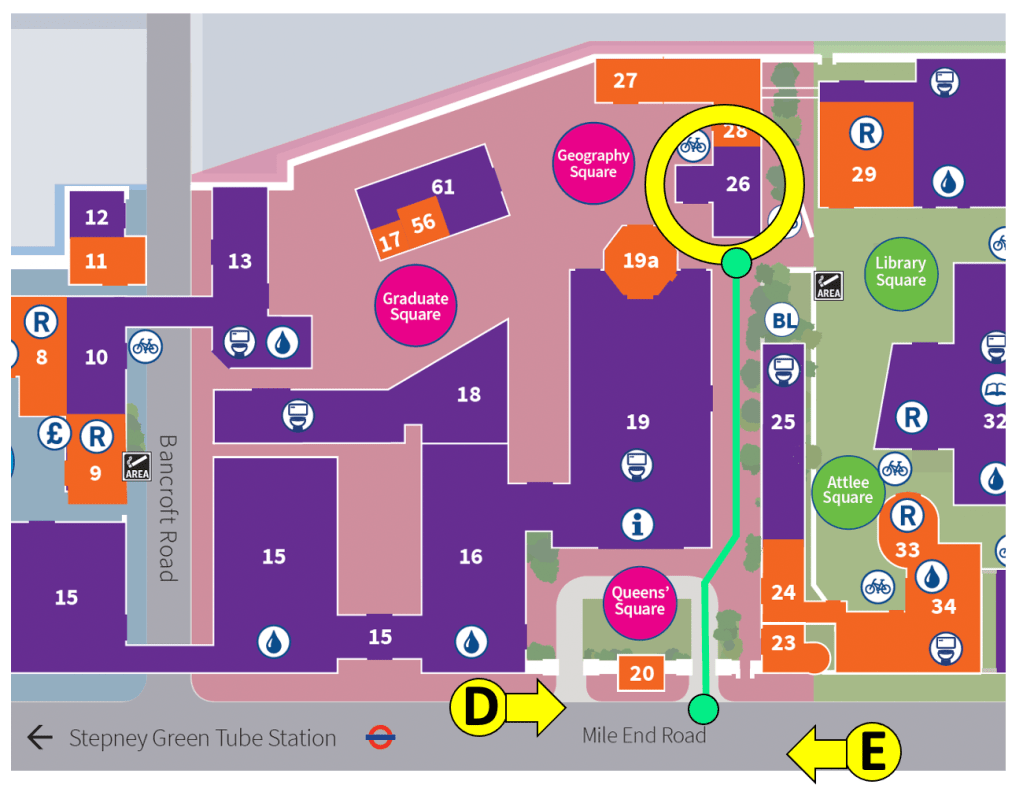 Geography Building is marked 26 on the map above, circled yellow. One route from Mile End Road is shown in bright green. Bus stops D and E are served by the 25 and 205 buses. D is heading to Mile End / Bow / Ilford, E is heading to Stepney Green and the City. Click for a full map of QMUL.
