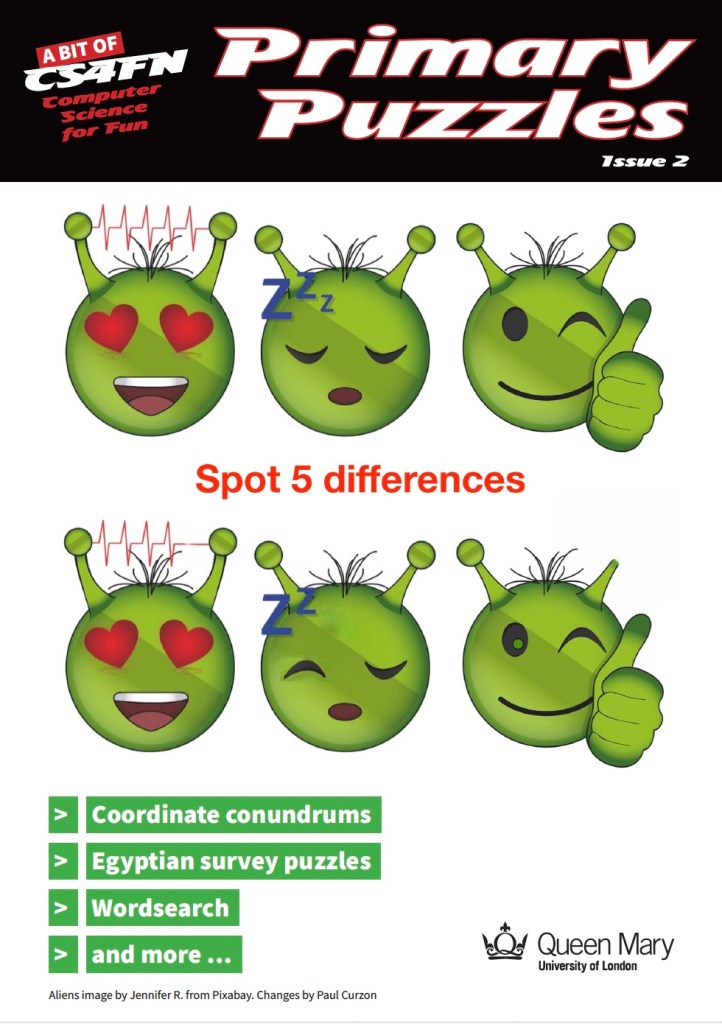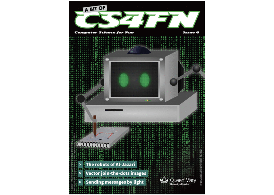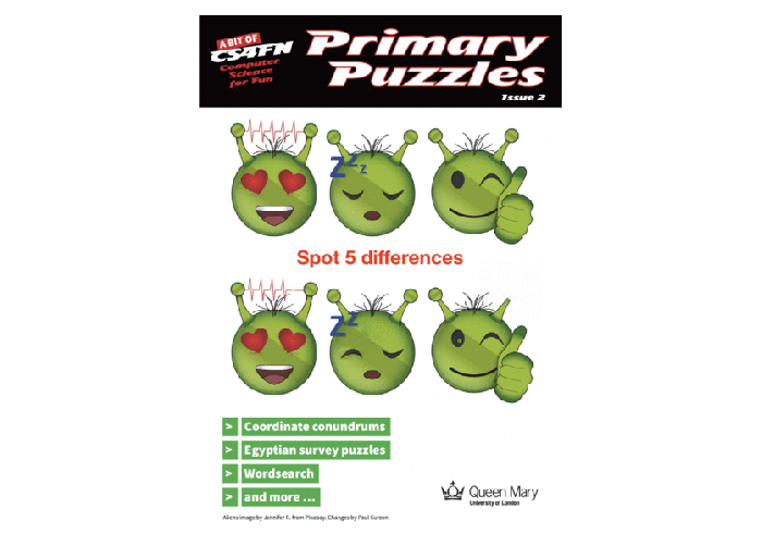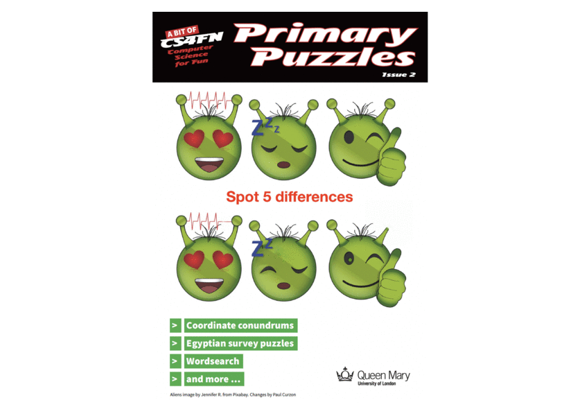 We have another two free booklets from our “A Bit of CS4FN” series, aimed at a primary school audience. One is issue 4 of the A Bit of CS4FN magazine (it’s a mini half-sized version (A5, 12 pages) of CS4FN (A4, 20 pages) written for a younger audience) and the other is Primary Puzzles issue 2 (same dimensions). You can download both from the links below and see at-a-glance what’s inside from the looping gifs.