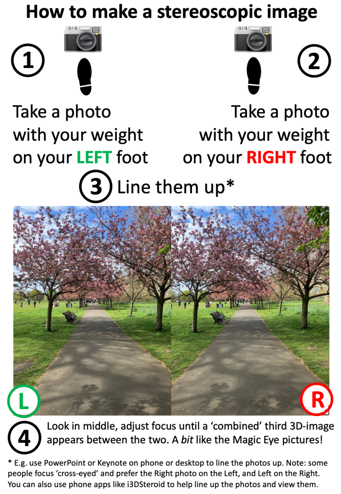 The activity really just involves taking two photos a few inches apart (recreating what your eyes see!) and lining them up, then adjusting your focus until the depth-perception 3D effect appears. See the summary in the poster at the top to get an idea. You don’t need any special equipment to view them.