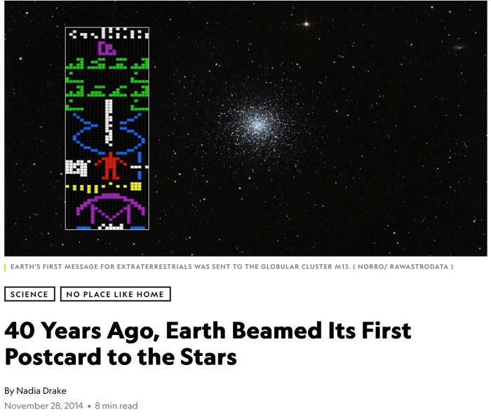 We’ll continue to add more activities but for now we’ll leave the last word to Frank Drake’s daughter Nadia who wrote this (in 2014) about the message’s transmission: “40 years ago, Earth beamed its first postcard to the stars” (make sure you read right to the end!).