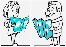 In the table: the Egyptian hieroglyphs, pack of cards, cartoon man and woman holding a map.