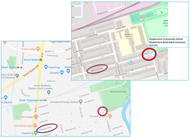 These buses from Seven Sisters [bus stop K] will take you to the St Ann’s [stop TE] which is closest to the start of Gladesmore Road. The 318 bus will take you slightly closer to the school (see route) as it turns left into Wargrave Avenue which is parallel, and then turns right and drops you on Grovelands Road – you’d then need to walk back towards the school. [NOTE that the route shows the school’s main entrance on Crowlands but you’d only need to go as far back as GLADESMORE Road)