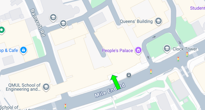 - Keep walking up Mile End Road, cross Bancroft Road and keep going until Bus Stop D. The entrance to the Engineering Building is on your left with the 5 metal bollards and glass door entrance. If you see an enormous white building (that’s the Queen’s Building) and clocktower, also the People’s Palace, you’ve gone a bit far :)