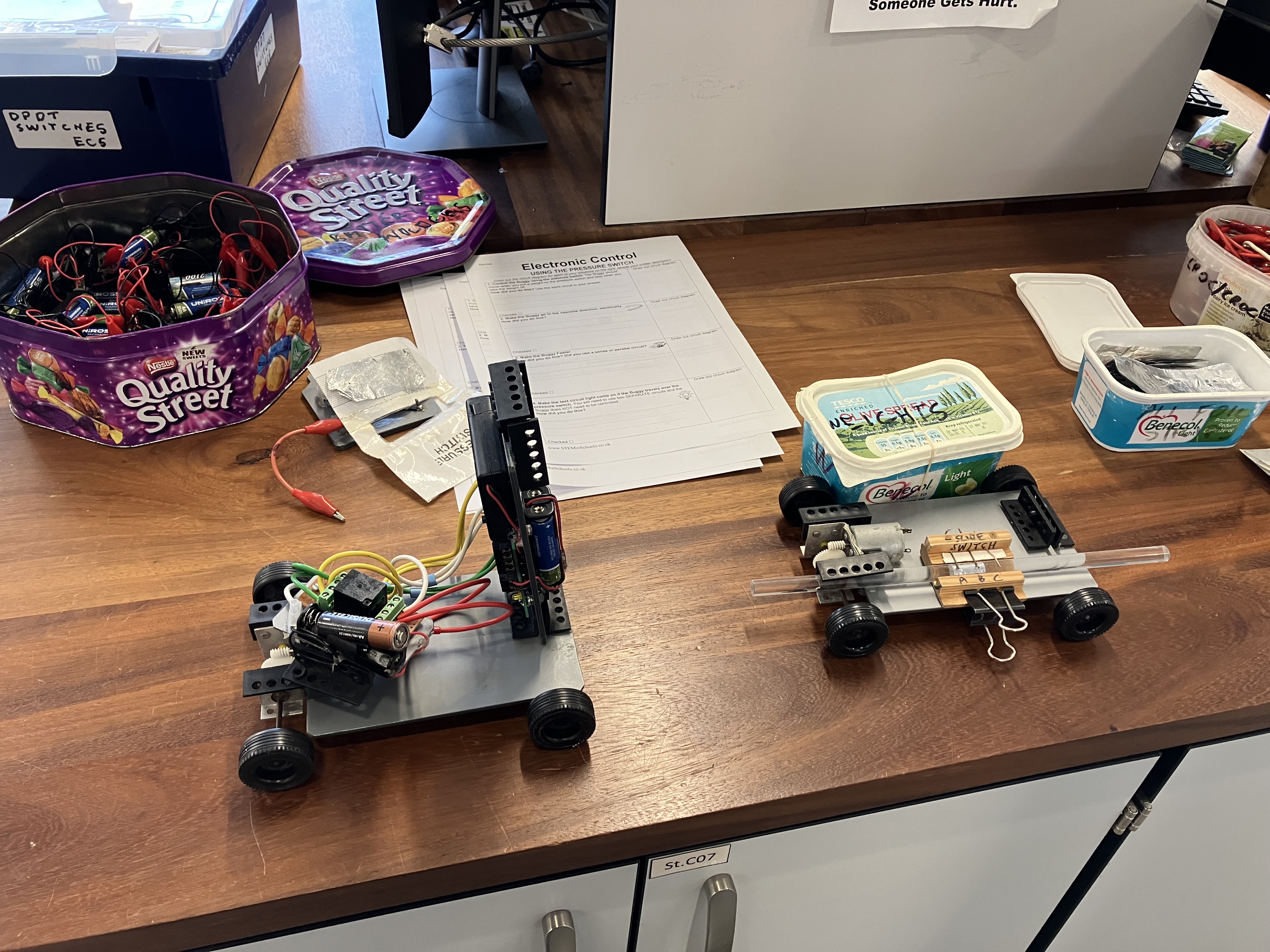 Jeremy King joined us from STEM in Schools and gave the class the rather fun task of using programmable controllers to make small wheeled buggies go forwards and backwards. The students used a looping programme to make the buggy move forwards for 40cm then pause, then move forwards again for 50cm then pause, then do the whole thing in reverse.