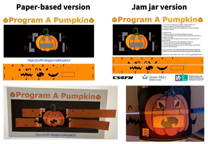 Design: Program A Pumpkin is a Hallowe’en variation of our popular Emotion Machine activity https://bit.ly/EmotionMachineActivity (developed by Paul Curzon and Peter McOwan) which lets you ‘programme’ different emotions. The adaptation for jam jars was inspired by Ho Huen’s version using empty Pringle cans (https://bit.ly/cs4fnpringles).