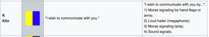 Of course this means that for effective communication everyone needs to know in advance what the code flags mean, and the rules for using them.